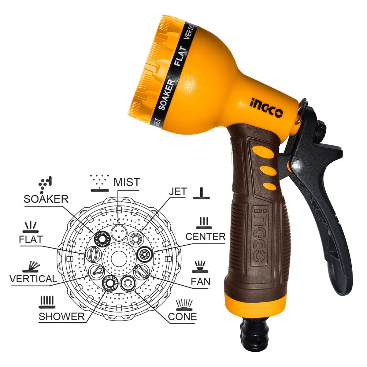 Λεπτομέρειες προϊόντος: Ρυθμιζόμενο ακροφύσιο με 9 μοτίβα ψεκασμού.